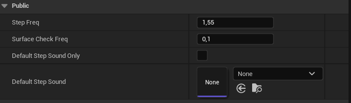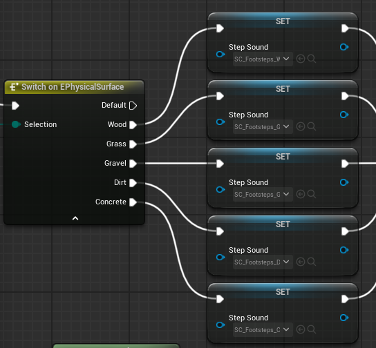 6) Open component "Footsteps" and connect "Step Sound" for every surface, as on below.